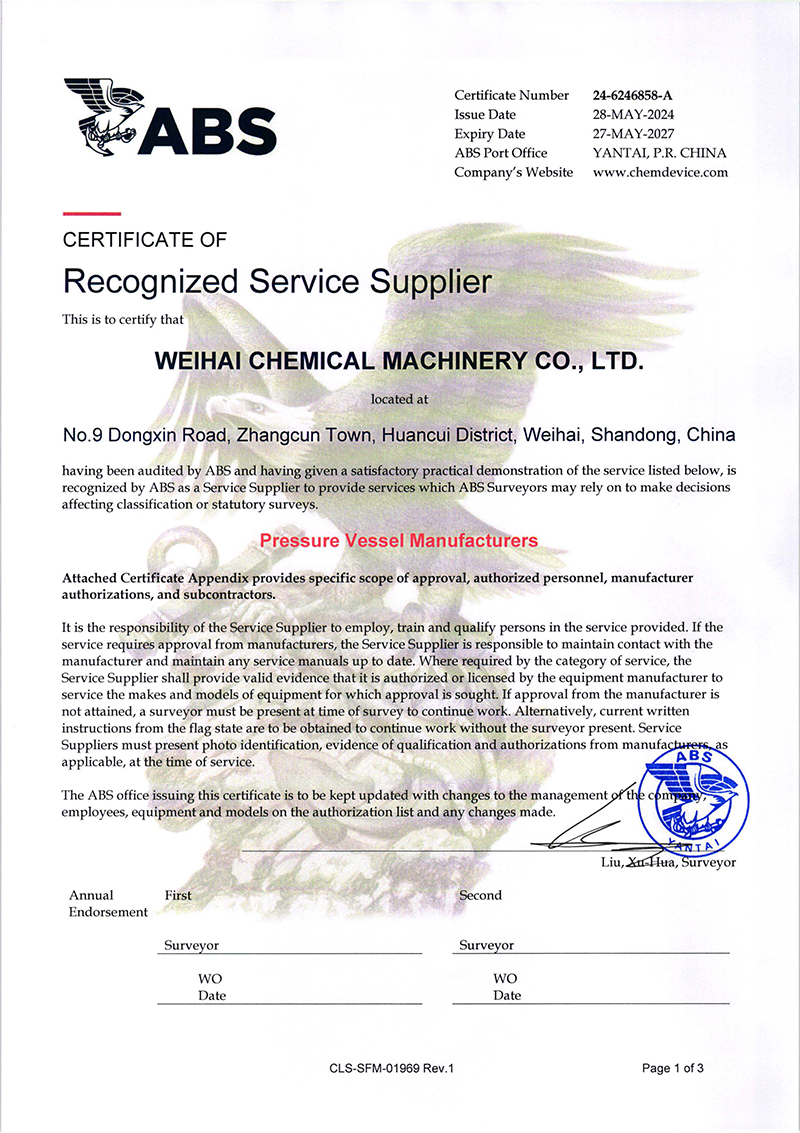 2024/09/15 查看詳情近日威海化工機械有限公司(以下簡稱“威?;瘷C”)壓力容器產(chǎn)品成功獲得了美國船級社(ABS)頒發(fā)的權(quán)威認證,是繼復(fù)合板產(chǎn)品ABS認證后拿到第二張ABS證書,這標志…