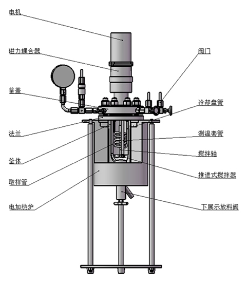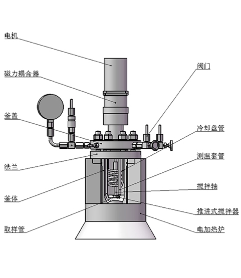 該結構為端面磁力密封裝置,依靠兩塊強力磁鋼異極相吸的原理通過磁場穿透密封罩體來實現力矩的無接觸式傳遞,由于電機直接帶動攪拌器,故而其攪拌特點是低轉矩高轉速(≤1500r/min),適合攪拌低粘度(cp≤2000mpa.s)或固體顆粒物含量較少的反應物料介質體系。